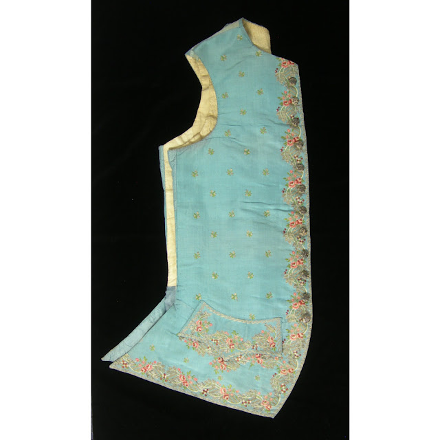 Czarna kamizelka i ta brązowa kurtka są jednymi z trzech zaledwie zabytków które znam, a które posiadają tego typu fantazyjne kołnierze. Trzeci znajduje się przy fraku z lat 90' w zbiorach Metropolitan Muzeum, którego pochodzenie jest określone "prawdopodobnie Francja". A może jest to zwyczaj wywodzący się z Hiszpanii... Trudno to stwierdzic na podstawie zaledwie trzech obiektów. Musiałabym sprawdzić w XVIII wiecznych żurnalach czy trafię na coś podobnego i czy będzie to jakoś opisane. Poniżej wspomniana analogia z MET: