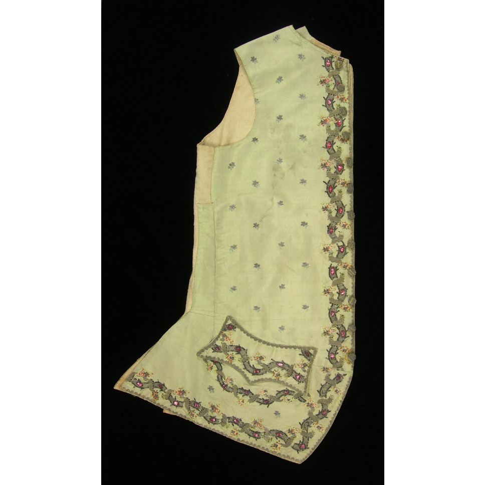Kamizela lata 30'-40', uszyta z tkaniny z charakterystycznym dla pierwszej połowy wieku (od lat 20') wzorem o dużych motywach przedstawionych naturalistycznie. Wykończenie złotym galonem. Rękawy wykonane są z surowego jedwabiu a nie z płótna jak bywało zazwyczaj w Anglii czy Francji. Nie mniej jednak widać pewną oszczędność: brak wzorzystego odcinanego mankietu, a tańsza tkanina zachodzi aż na ramiona z czym można się spotkać rzadko - zazwyczaj w kamizelkach końca wieku. Poza tym jak widać na przykładzie tej, wcześniejszej i poniższej kamizeli, w obiektach tego typu pochodzenia hiszpańskiego, unikano zgrzebnego płótna. Tradycyjna arystokracja ubierała się wykwintnie nie tylko na pokaz, ale również dla zasady i utrzymania pewnego poziomu. Prawdopodobnie, jeżeli nie byli wystarczająco majętni, to woleli mieć mniej, strojów, ale porządnych, niż więcej ale oszczędnych, byle być modnym. Jest to zupełnie inna tendencja niż w liberalnych społeczeństwach amerykańskich, francuskich, czy angielskich.